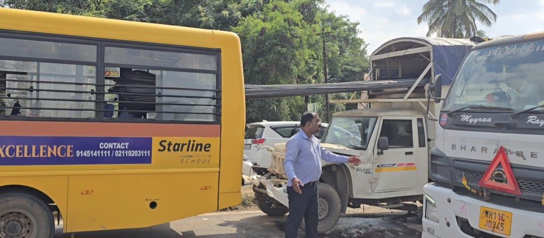 पुणे-सोलापूर महामार्गावरुन बस बुधवारी दुपारी ऊरळी कांचनकडे निघाली होती. बसमध्ये २० ते २५ विद्यार्थी होते. त्यावेळी अचानक एक दुचाकीस्वार आडवा आल्याने बस चालकाने प्रसंगावधान राखून ब्रेक दाबला. त्यावेळी पाठीमागून सळई वाहतूक करणारा ट्रक होता. ट्रकने बसला पाठीमागून धडक दिली. ट्रकवर ठेवलेल्या सळई काच फोडून आत शिरली. या घटनेत सहा विद्यार्थी जखमी झाले. बस चालकने आणि नागरिकांनी बसमधील विद्यार्थ्यांना बाहेर काढले. काचेचे तुकडे उडाल्याने मुलांना किरकोळ दुखापत झाली आहे. काही मुलांंवर ऊरळी कांचन येथील रुग्णालयात उपचार करून सोडून देण्यात आले, अशी माहिती उरळी कांचन पोलीस ठाण्याचे पाेलीस निरीक्षक शंकर पाटील यांनी दिली. तसेच बसला आडवा आलेला ७० वर्षीय दुचाकीस्वार जखमी झाले आहेत. त्यांच्यावर लोणी काळभोर येथील रुग्णालयात उपचार सुरू आहेत.