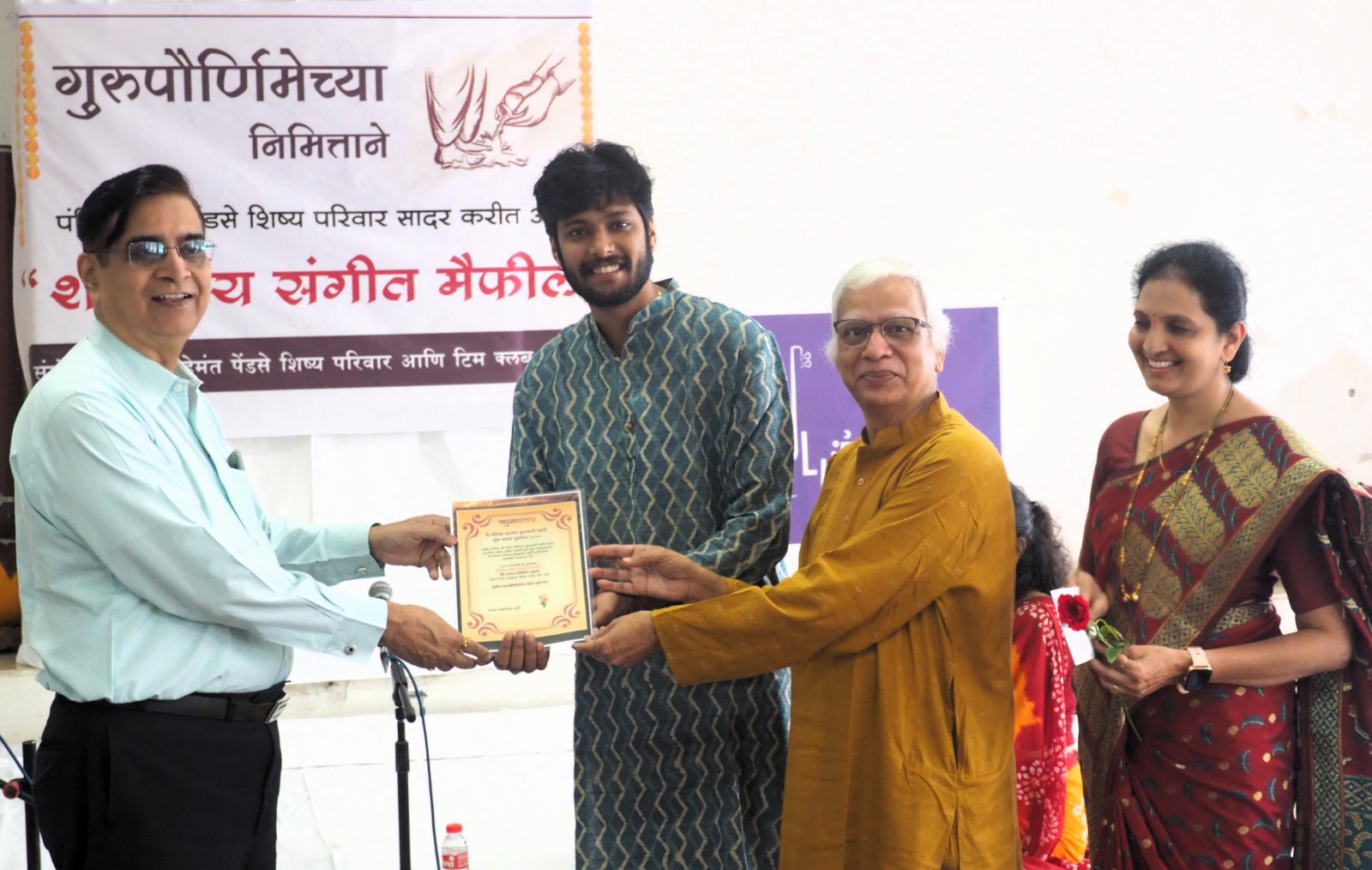 मैफलीची सुरुवात अनुराधा लेले यांनी राग अहिरभैरवमधील ‘हे लाल अलसाने’ या बंदिशीने केली. त्यानंतर द्रुत लयीत पं. हेमंत पेंडसे रचित ‘करम तुही करतार तु’ ही बंदिश सादर करून ‘मान रे मोरा मनवा तुम’ ही रचना सादर केली. संदिप देशमुख यांनी राग ललतमधील ‘रैन का सपना’ ही पारंपरिक रचना आपल्या मधूर आवाजात सादर केली तर ‘मारी घुंगरवा खेलनवा’ ही दृत लयीत सादर केलेली रचना रसिकांना विशेष भावली. पंडित अभिषेकीबुवा यांनी गायलेली राग परमेश्वरीमधील ‘मातेश्वरी परमेश्वरी’ ही बंदिश राधिका ताम्हनकर यांनी प्रभावीपणे सादर करून त्याला जोडून पंडित हेमंत पेंडसे यांनी रचलेला ‘दिर दिर तानुम् त देरे ना’ हा तराणा सादर केला.
