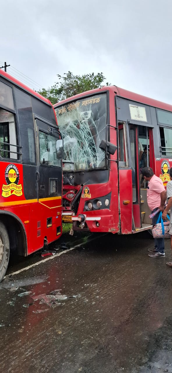 दोन एसटी बसमध्ये समोरासमोर भीषण अपघात झाला. अपघातात १२ प्रवासी जखमी झाले असून त्यांच्यावर ग्रामीण रुग्णालय, पौड येथे उपचार सुरू आहेत. श्रीवर्धनकडून बीडकडे जाणारी एसटी बस (क्रमांक एम एच ०६ बी डब्लू ७९८५) गाडीचा अचानक ब्रेक फेल झाला. त्यामुळे चालकाने बस रस्त्याच्या उजव्या बाजूला घेण्याचा प्रयत्न केला. त्याचवेळी चिंचवडहून खेड (रायगड) कडे जाणारी दुसरी एसटी बस (क्रमांक एम एच १४ इ ३२८३) समोरून येत होती. त्यामुळे दोन्ही बसांची समोरासमोर जोरदार धडक झाली. अपघातानंतर प्रवाशांमध्ये आरडाओरड झाली. अपघातानंतर स्थानिकांनी तत्काळ घटनास्थळी धाव घेत जखमींना बाहेर काढून उपचारासाठी ग्रामीण रुग्णालय, पौड येथे दाखल केले.